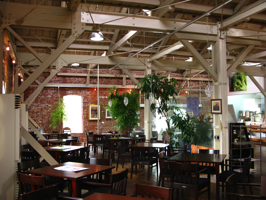 「のこぎり屋根」の工場を再利用した「ベーカリー」がありました。